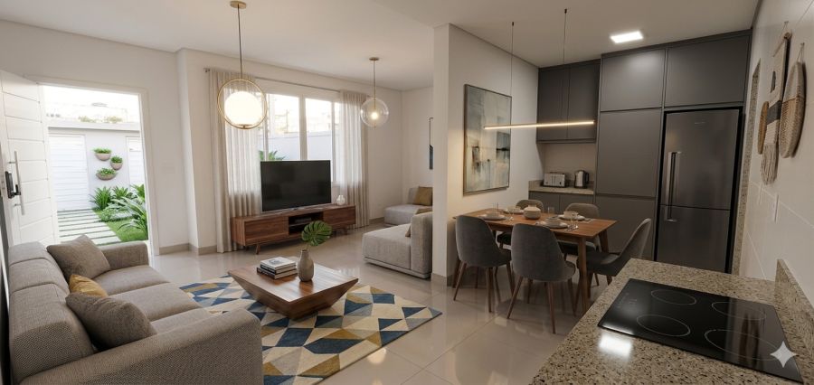 Com uma área total e privativa de 96,00 m², a casa possui uma planta inteligente e funcional que privilegia a integração dos ambientes. A unidade conta com: